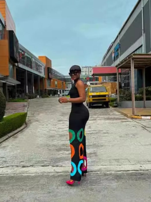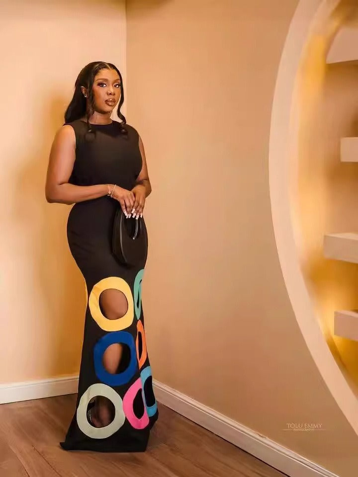 Fashionable round neck sleeveless color blocked hollow embroidery A-list long dress