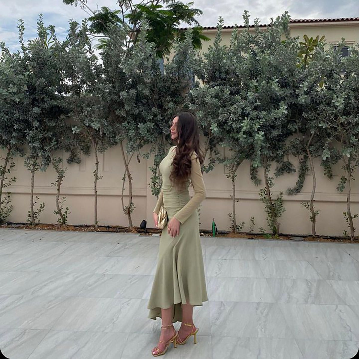 Wrinkle decoration slimming and slimming temperament Midi irregular long sleeved dress